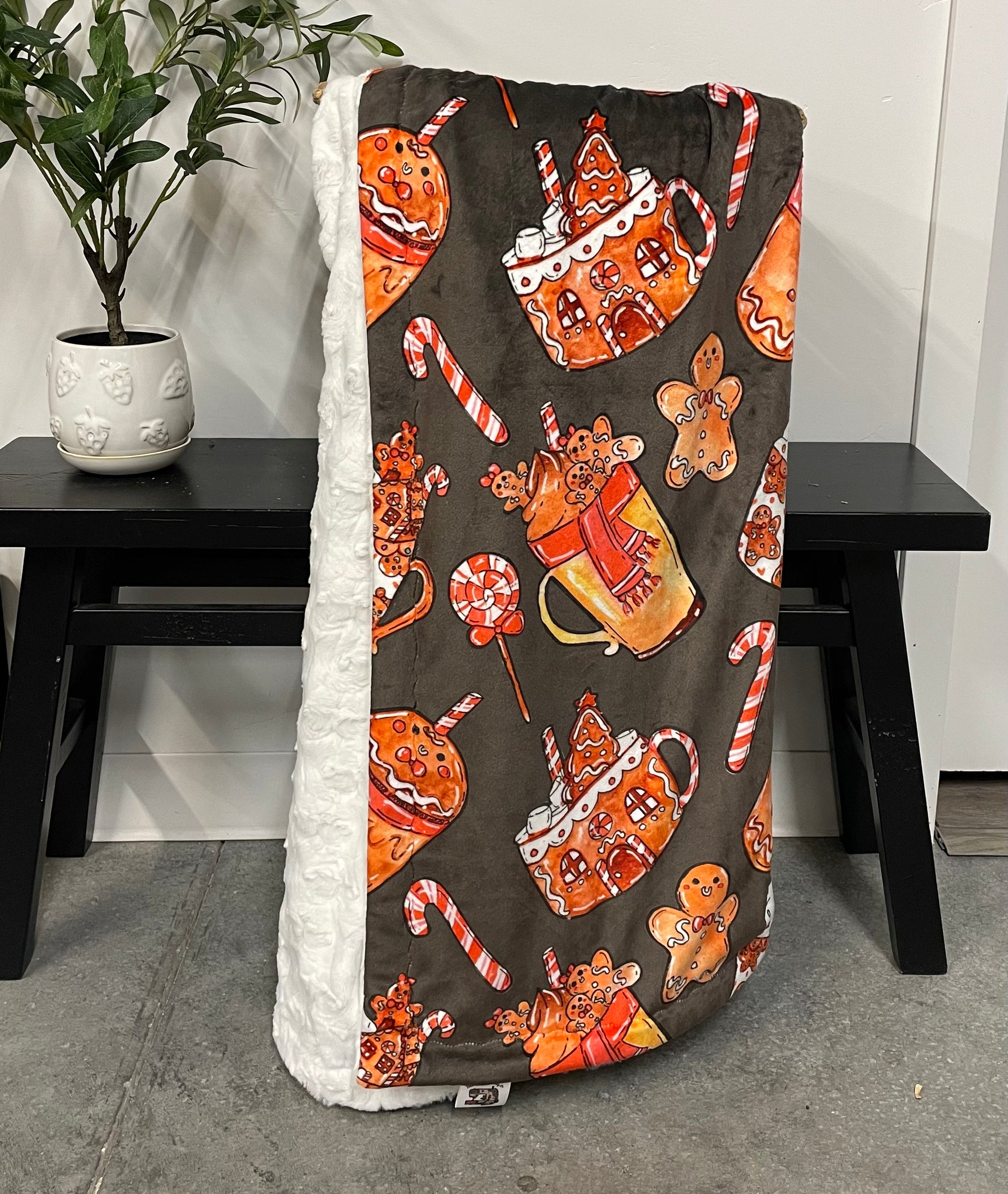 Top is a designer printed minky, luxe cuddle natural luna minky back & an enveloped finish.