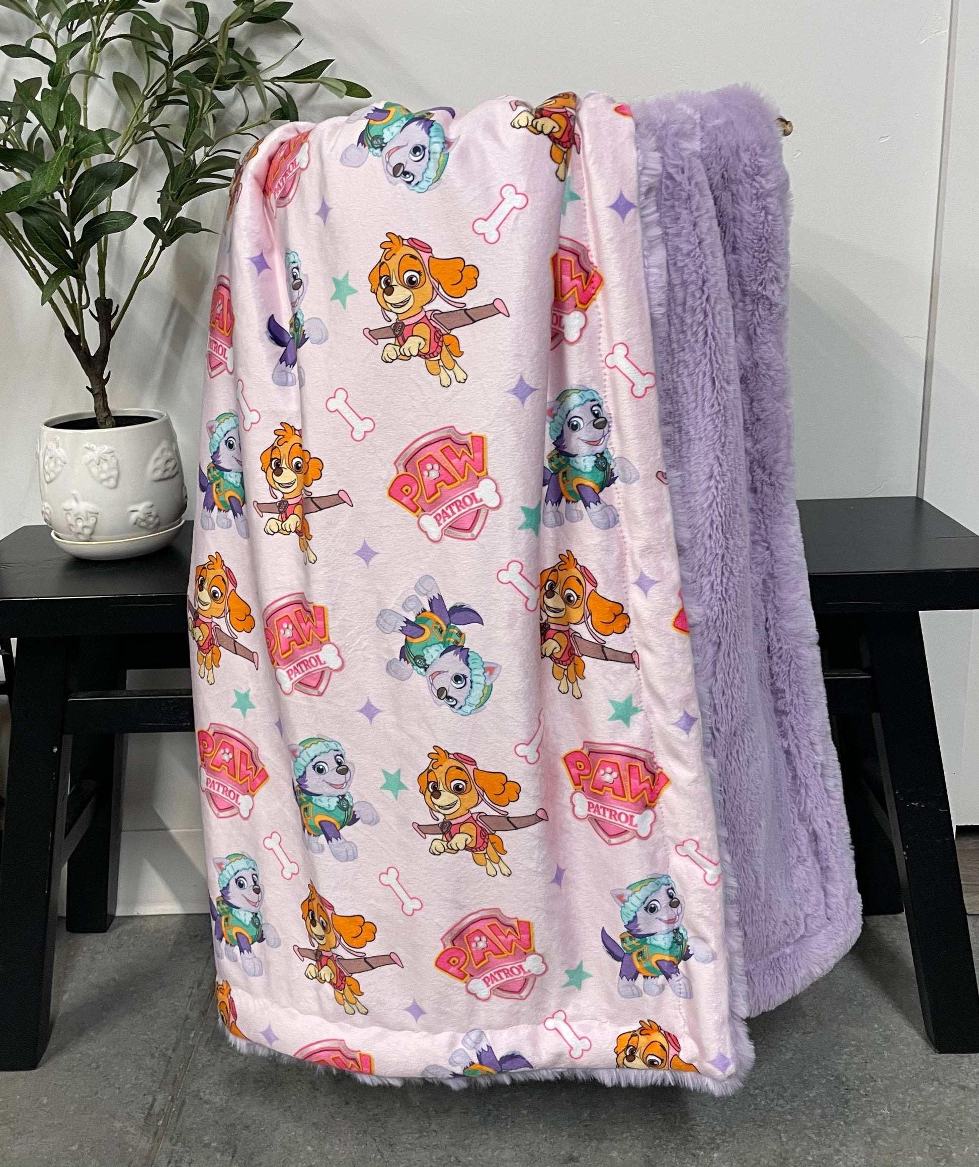 Top is a super soft minky print, with a lavender bunny minky back & an enveloped finish.
