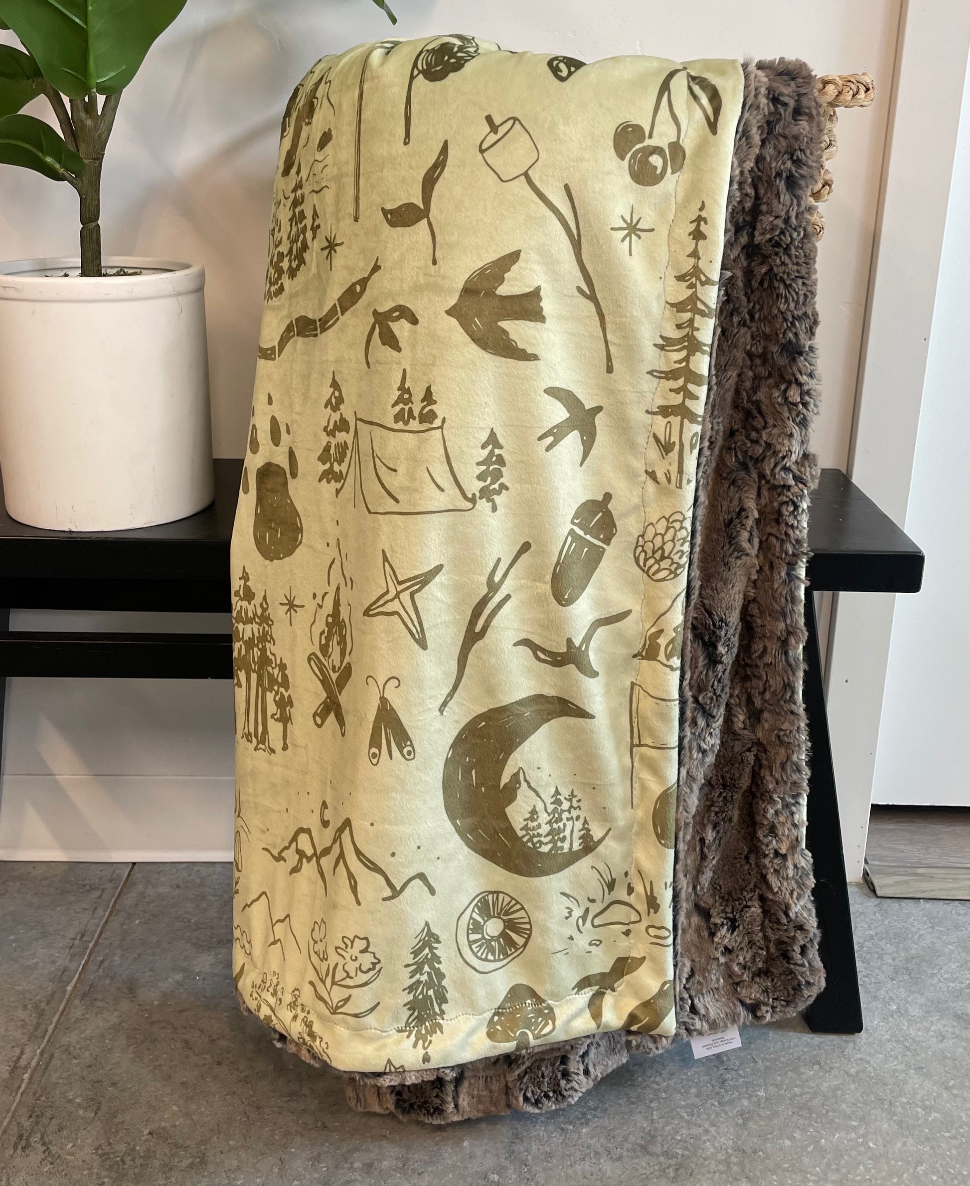 Top is a designer printed minky, wild rabbit walnut minky back & an enveloped finish.