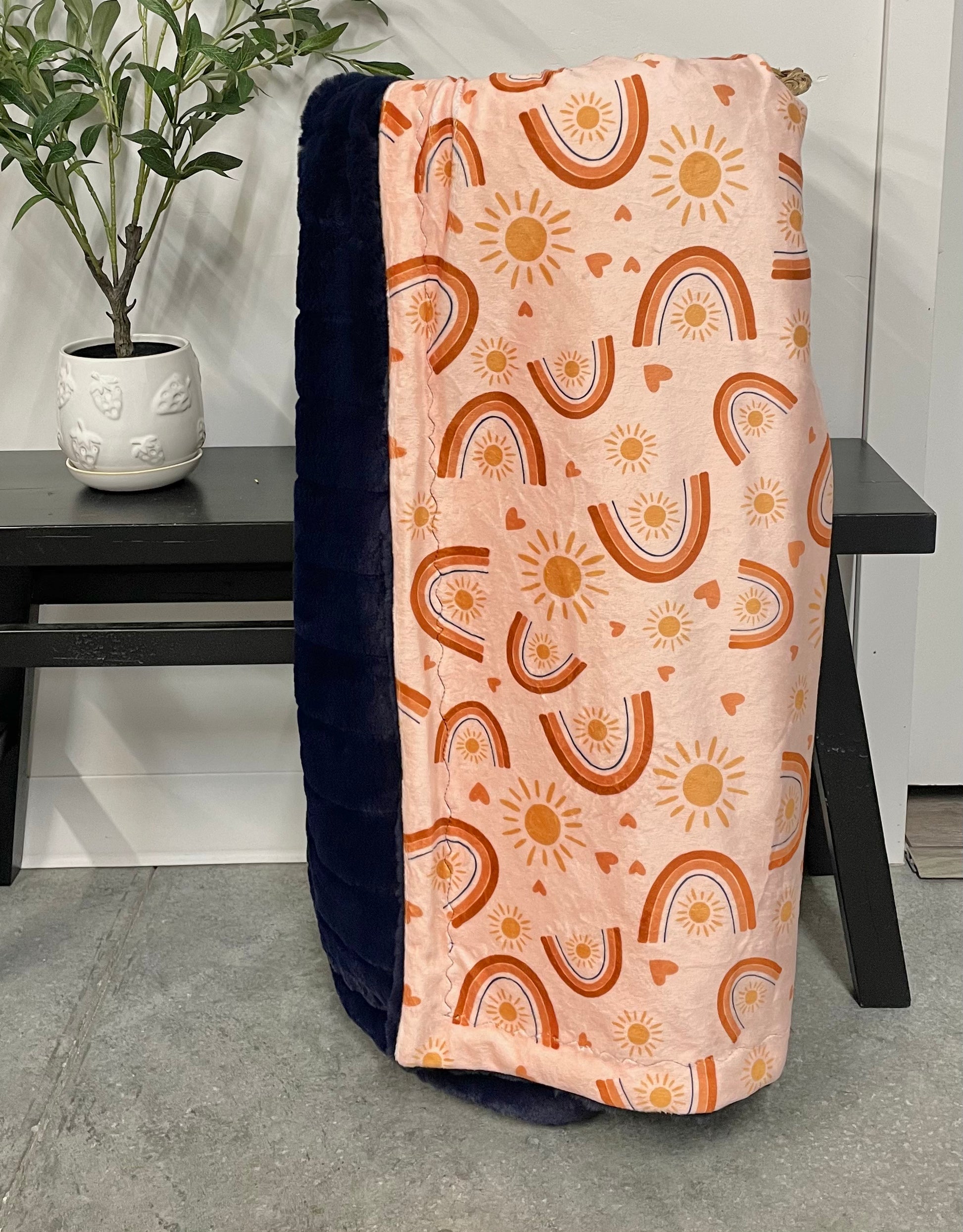 Top is a super soft minky print, with a navy Sydney minky back & an enveloped finish.