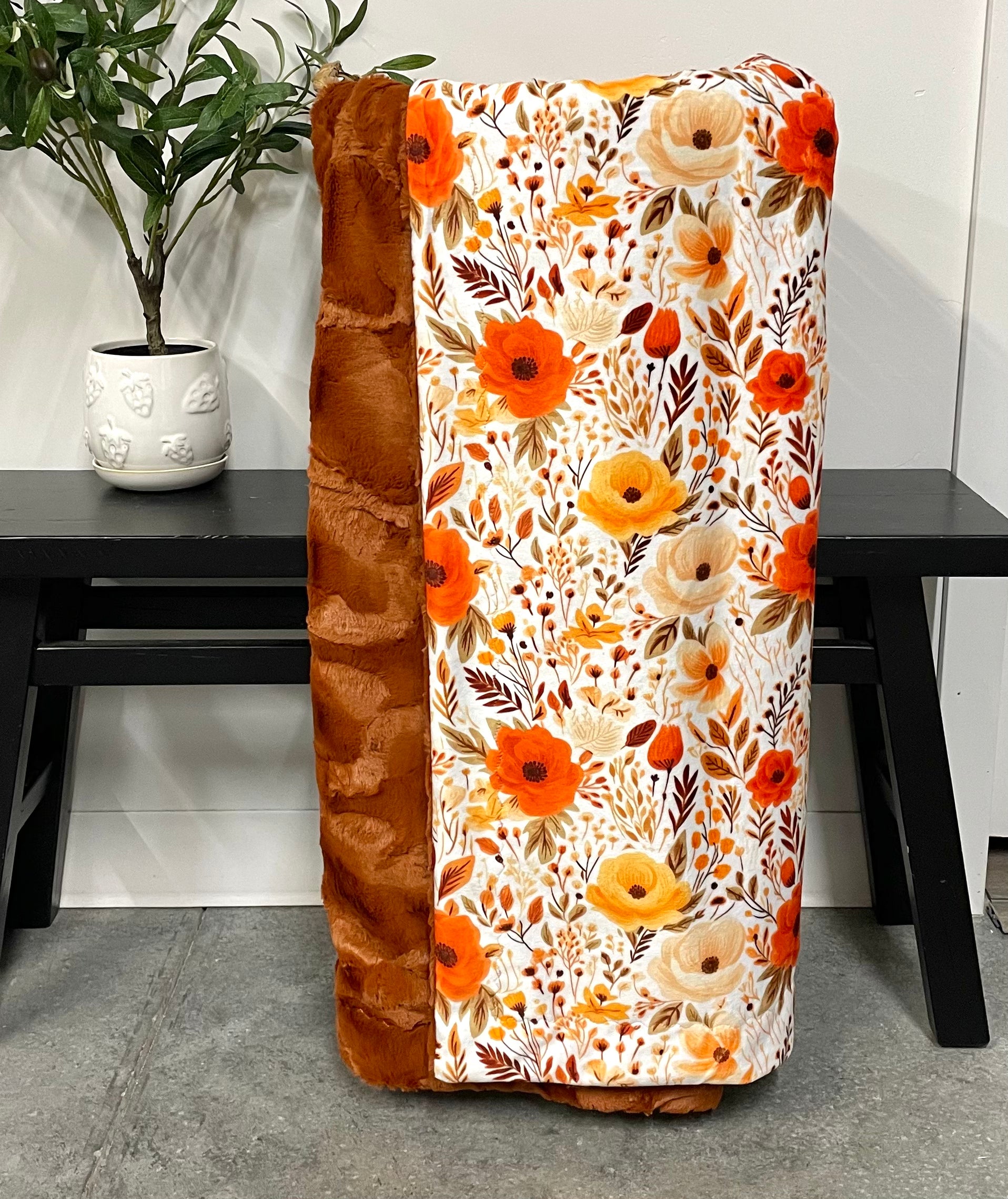 Top is a super soft minky print, with a luxe ginger hide minky back & an enveloped finish.